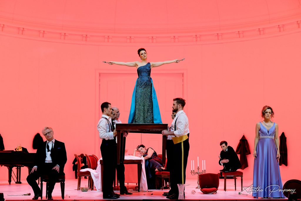 Distribution : Violetta Valéry : Martina Russomanno – Alfredo Germont : Amitai Pati – Giorgio Germont : Vito Priante – Flora Bervoix : Bernadette Johns – Annina : Ana Escudero – Dottore Grenvil : Michał Karski – Gastone di Létorières : Massimo Frigato – Barone Douphol : Pierre Gennaï – Il Marchese d’Obigny : Carlos Reynoso – Giuseppe : Namdeuk Lee – Un domestico di Flora : Burak Karaoglanoglu – Un commissionario : Roman Modzelewski – Artistes de complément : Annabelle Marasi, Juliette Malala Tardif, Bruno Roseau, Nicolas Umdenstock / mars 2025, Opéra national du Rhin – Strasbourg