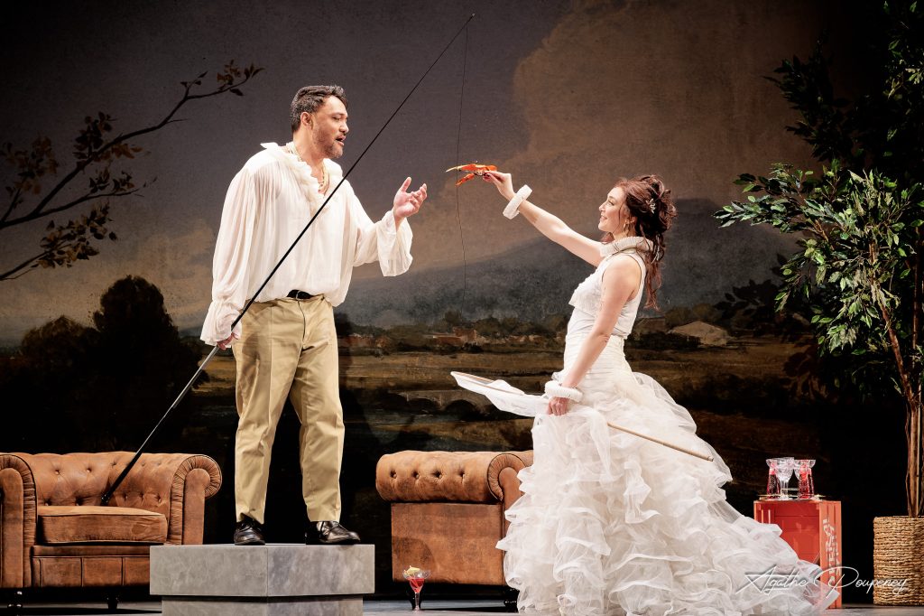 Mise en scène : Barrie Kosky – Direction musicale : Stefano Montanari – Décors : Rufus Didwiszus – Costumes : Victoria Behr – Lumières : Ulrich Eh – Orchestre et choeur : Opéra national de Paris – Chef des choeurs : Ching-Lien Wu – Chorégraphie : Otto Pichler – Dramaturgie et adaptation des dialogues : Antonio Cuenca Ruiz / Distribution : Falsacappa : Marcel Beekman – Fiorella : Marie Perbost – Fragoletto : Antoinette Dennefeld – Le Baron de Campo-Tasso : Yann Beuron – Le Chef des carabiniers : Laurent Naouri – Le Duc de Mantoue : Mathias Vidal – Le Comte de Gloria-Cassis : Philippe Talbot – La Princesse de Grenade : Adriana Bignagni Lesca – Carmagnola : Leonardo Cortellazzi – Domino : Éric Huchet – Barbavano : Franck Leguérinel – Pietro : Rodolphe Briand – Zerlina : Ilanah Lobel-Torres – Fiametta : Clara Guillon – Bianca : Maria Warenberg – La Marquise : Doris Lamprecht – La Duchesse : Hélène Schneiderman – Le Précepteur : Luis-Felipe Sousa – Cicinella : Marine Chagnon – Adolphe de Valladolid : Flore Royer – Antonio : Sandrine Sarroche – Sangrietta, Pipa :Manon Barthélémy – Tortilla : Rachella Kingswijk – Burratina : Cécile L’Heureux – Castagnetta, Pipetta : Corinne Martin – Pizzaiolo : Victorien Bonnet – Flamenco : Nicolas Jean-Brianchon – Zucchini, Pipo : Jules Robin – Siestasubito : Hédi Tarkani / septembre 2024, Opéra national de Paris – Palais Garnier