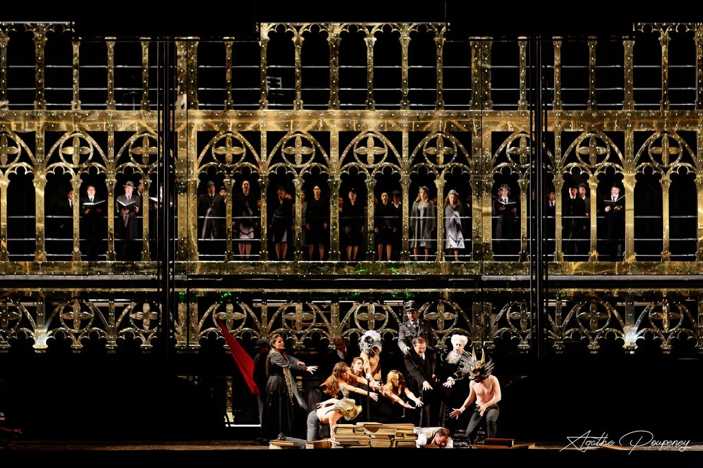 Mise en scène : David Hermann – Direction musicale : Daniele Rustioni – Décors et vidéo : Jo Schramm – Costumes : Bettina Walter – Lumières : Fabrice Kebour – Orchestre et choeur : Opéra de Lyon – Chef des choeurs : Benedict Kearn – Chorégraphie et mouvements : Jean-Philippe Guilois /Distribution : Hermann, Landgrave de Thuringe : Liang Li – Tannhäuser : Stephen Gould – Wolfram von Eschenbach : Christoph Pohl – Walther von der Vogelweide : Robert Lewis – Reinmar von Zweter : Dumitru Madarasan – Biterolf : Pete Thanapat – Heinrich der Schreiber : Kristofer Lundin – Elisabeth : Johanni van Oostrum – Venus : Irène Roberts – Ein junger Hirt : Giulia Scopelliti – Danseuses : Marie Buysschaert, Lucía Gervasoni, Eulalie Rambaud, Louise Tertrais, Lara Villegas, Justine Volo / octobre 2022, Opéra national de Lyon